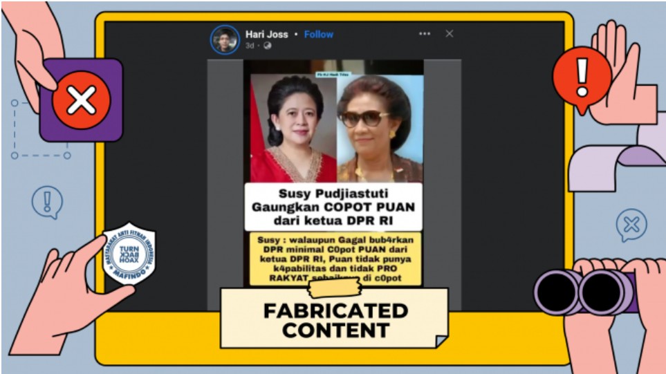 Unggahan video berisi klaim “Susi Pudjiastuti gaungkan pencopotan Puan Maharani dari kursi Ketua DPR RI” merupakan konten palsu (fabricated content).