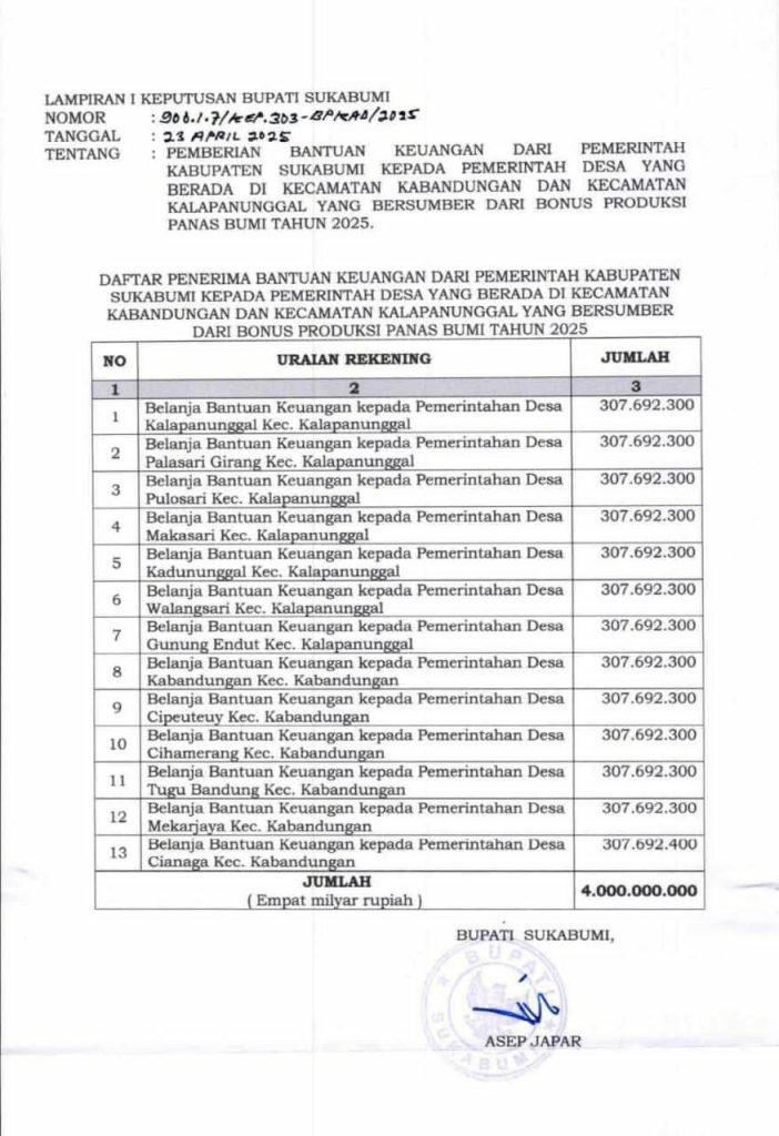 BP yang diterima oleh 13 desa di dua kecamatan, yaitu Kabandungan dan Kalapanunggal, masing-masing sebesar Rp307.692.000. Sementara itu, pada tahun berjalan 2024, DBH untuk Kabupaten Sukabumi adalah Rp10,12 miliar. BP nantinya dapat digunakan langsung oleh desa penghasil, sedangkan DBH akan masuk ke anggaran belanja daerah (APBD).